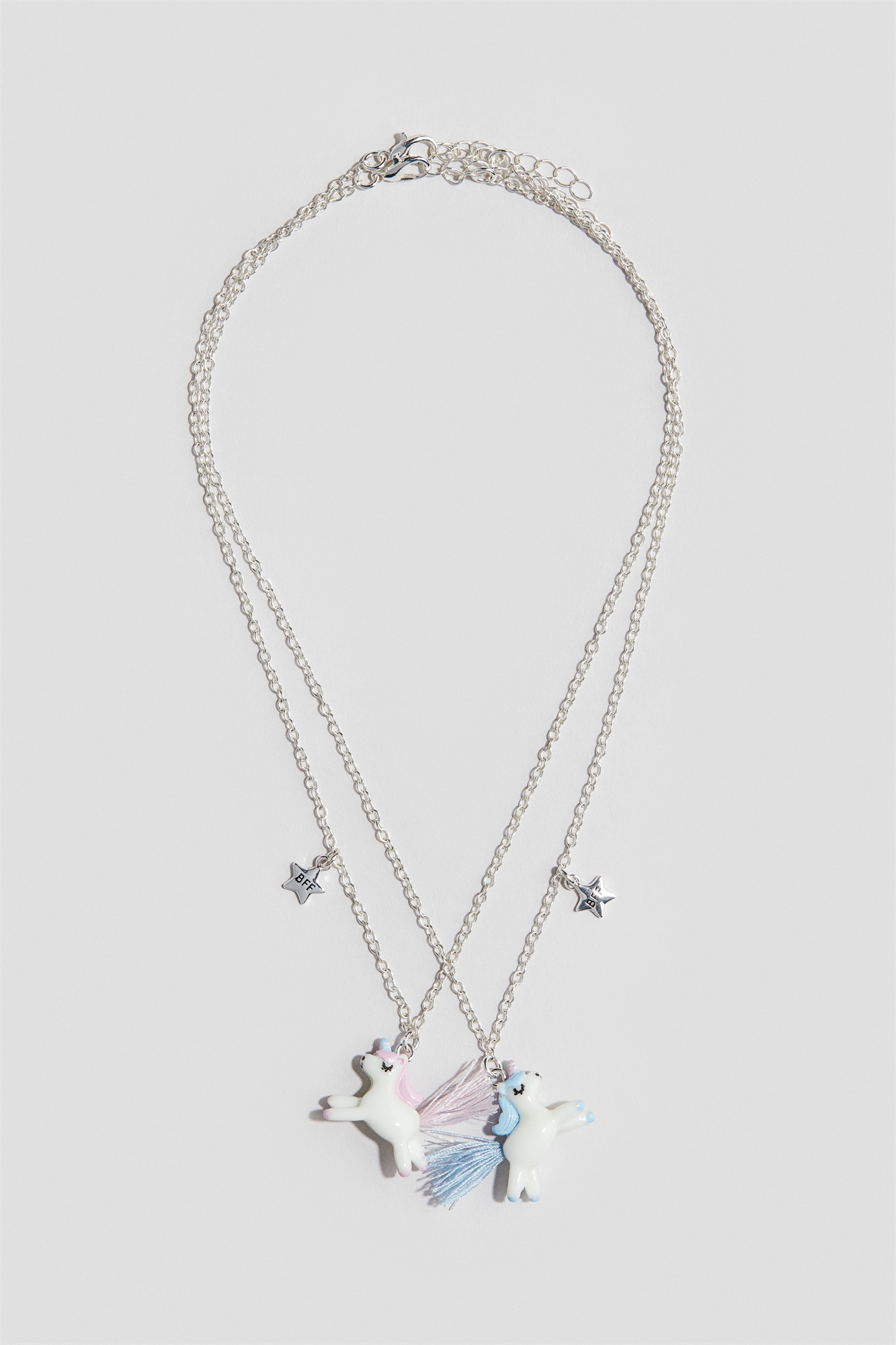 Тонкие металлические цепочки с подвесками в виде звезды и единорога - одна для вас, другая для вашего лучшего друга. Регулируемая длина с застежкой-триггером.
