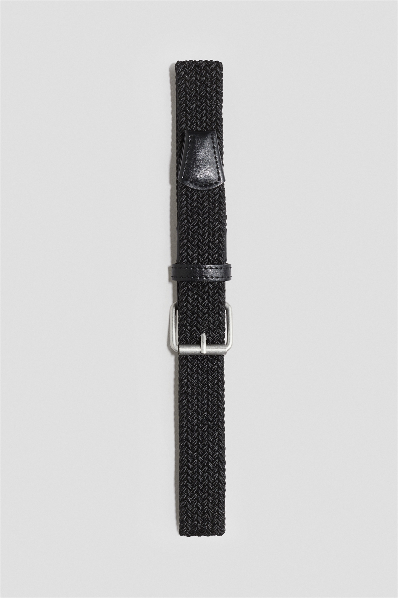 Плетеный ремень из эластичной ткани с отделкой и металлической пряжкой.