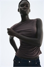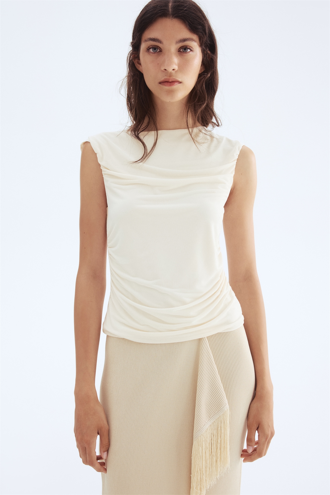 Облегающий топ из мягкого джерси с горловиной-лодочкой, рукавами-кап и сборками по бокам, создающими эффект легкой драпировки спереди. Подкладка из джерси.