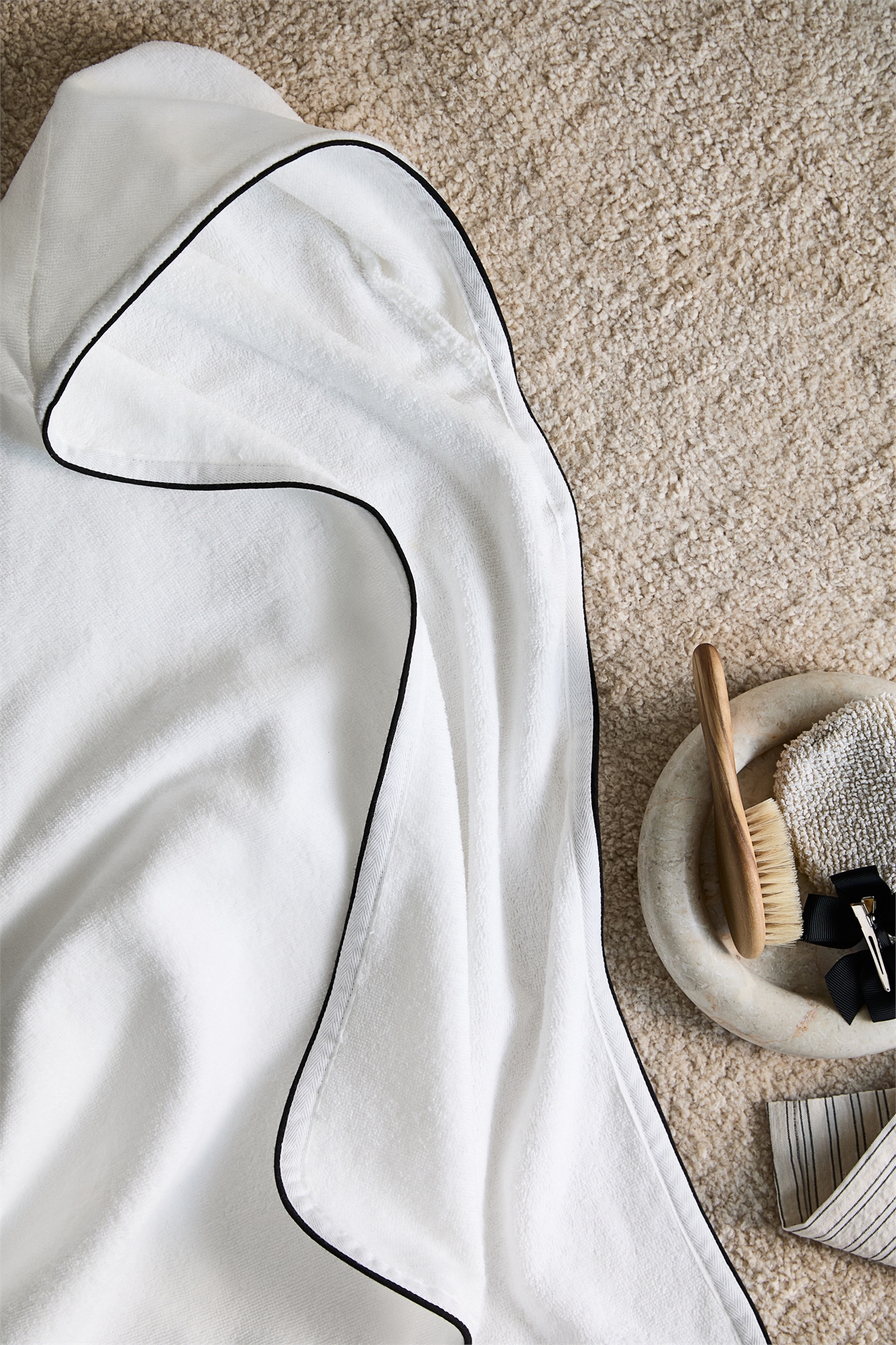 Банное полотенце с капюшоном из мягкой хлопковой махровой ткани, украшенное акцентной цветной отделкой по краю.