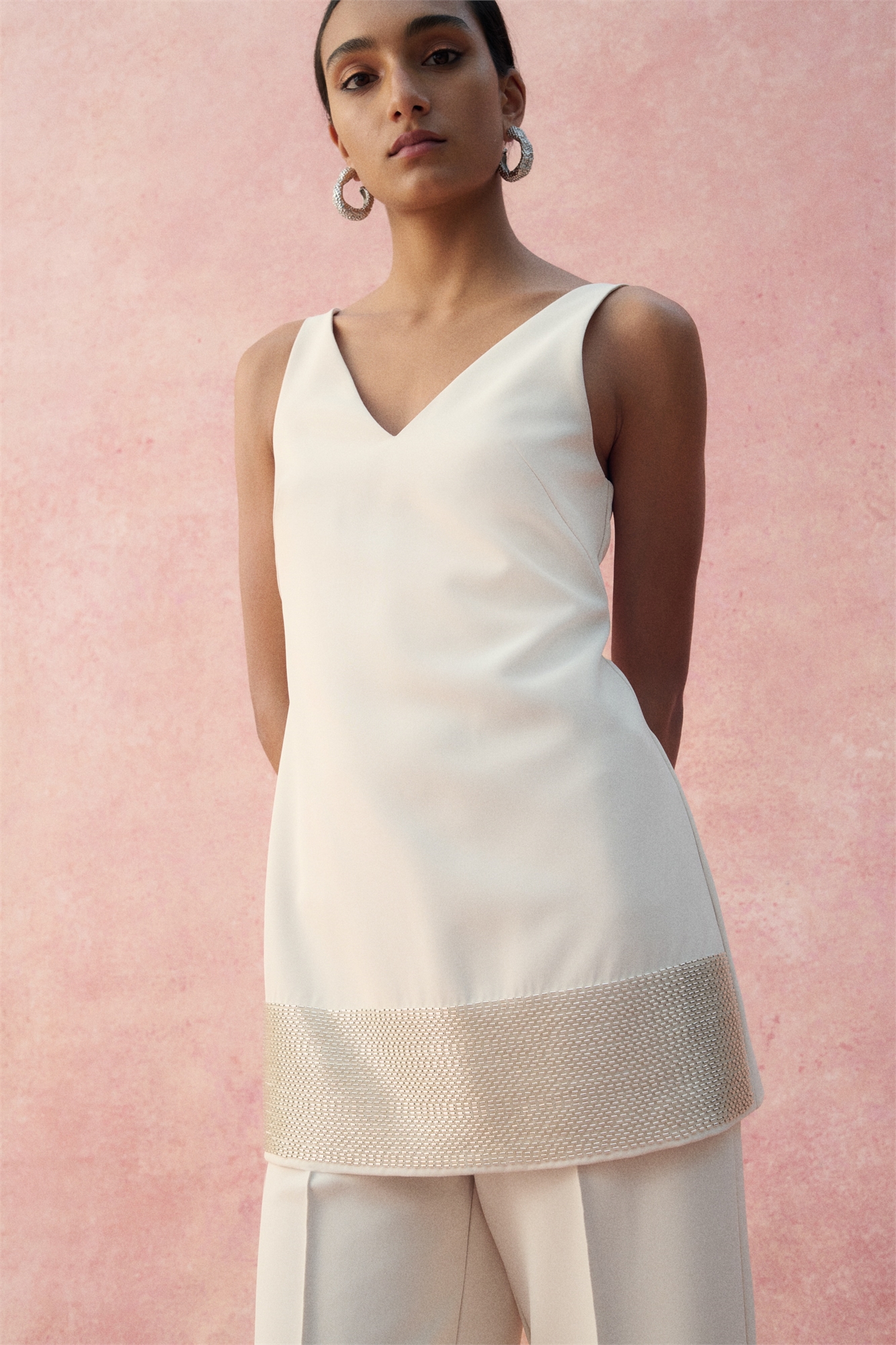 Короткое платье без рукавов из тканого материала с каймой из бусин спереди на подоле. Глубокий V-образный вырез спереди и сзади, формирующие вытачки и потайная застежка на молнию и крючок-глазок сзади. На подкладке.