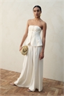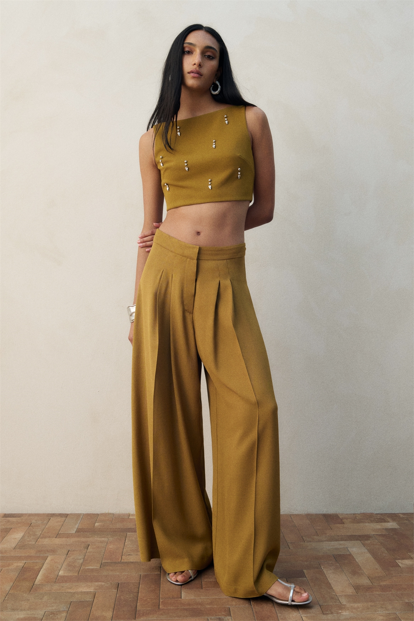 Свободные брюки длиной до щиколоток из тканого материала с высокой талией и ширинкой на молнии с потайной пуговицей и застежкой на крючок и планку. Широкие ноги со складками спереди.