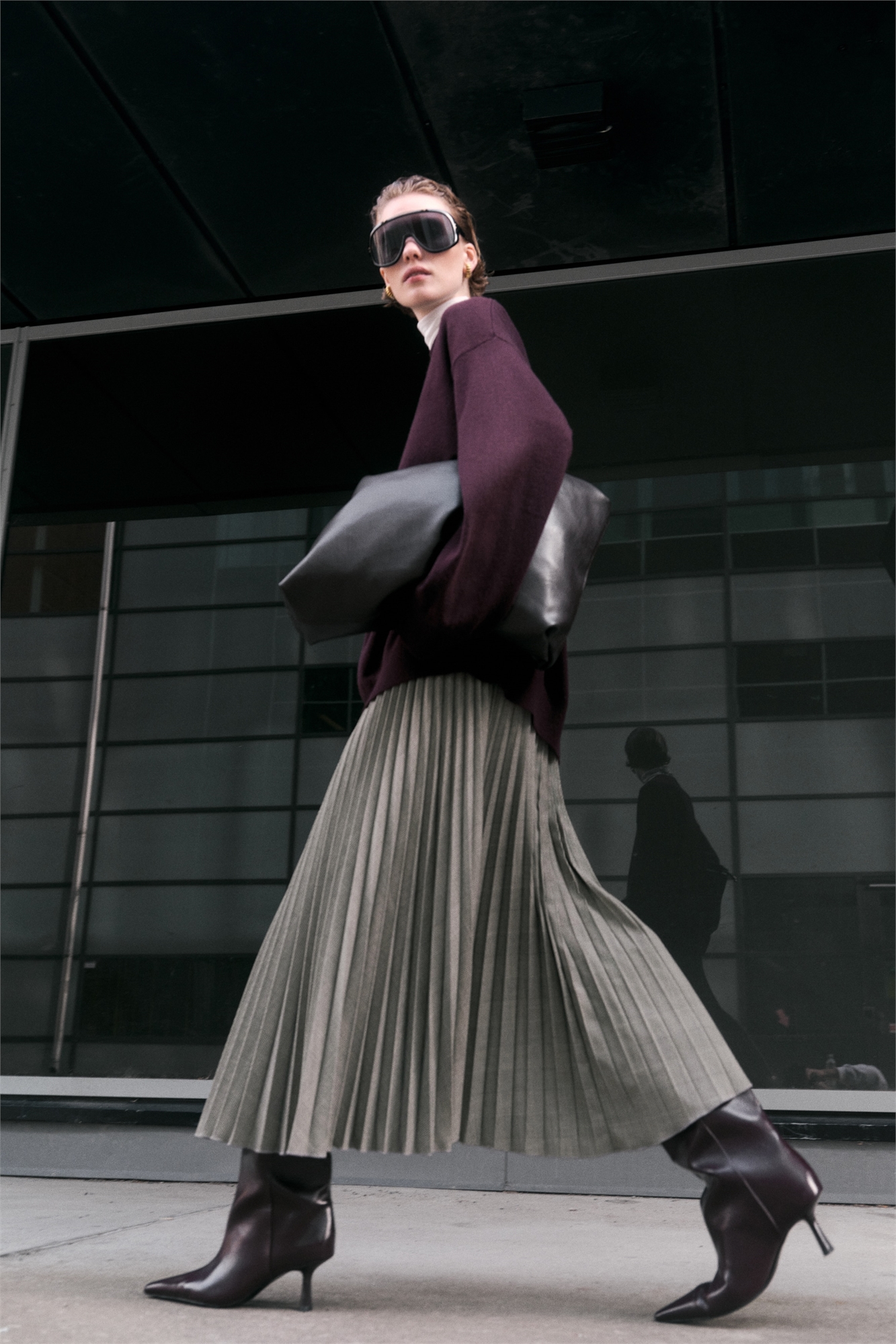 Свободная юбка длиной до колен из плиссированного полотна с высокой талией и потайной застежкой на молнию и крючок с ушком с одной стороны. Оверлочный край по подолу. Без отделки.