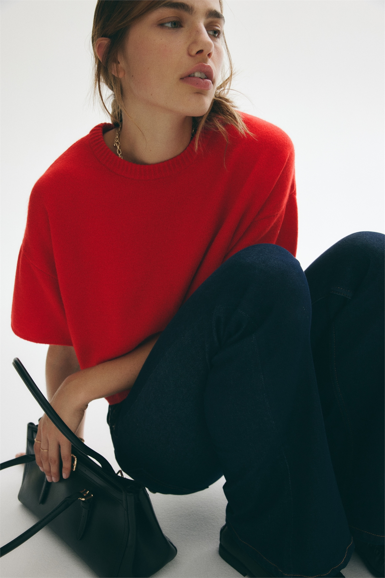 Джемпер свободного покроя из мягкого трикотажа с начесом. Круглый ребристый вырез, спущенные плечи и короткие рукава. Узкий рубчик на манжетах и подоле.