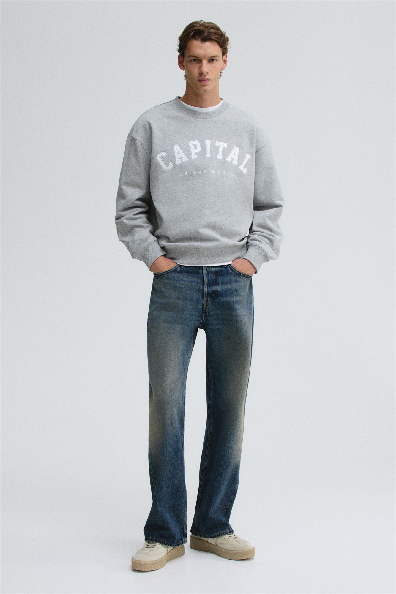 Топ из толстовки средней плотности с круглым вырезом, отделанным ребрами, спущенными плечами и окантовкой на манжетах и подоле. Свободный крой для пышного, но не чрезмерно большого силуэта.