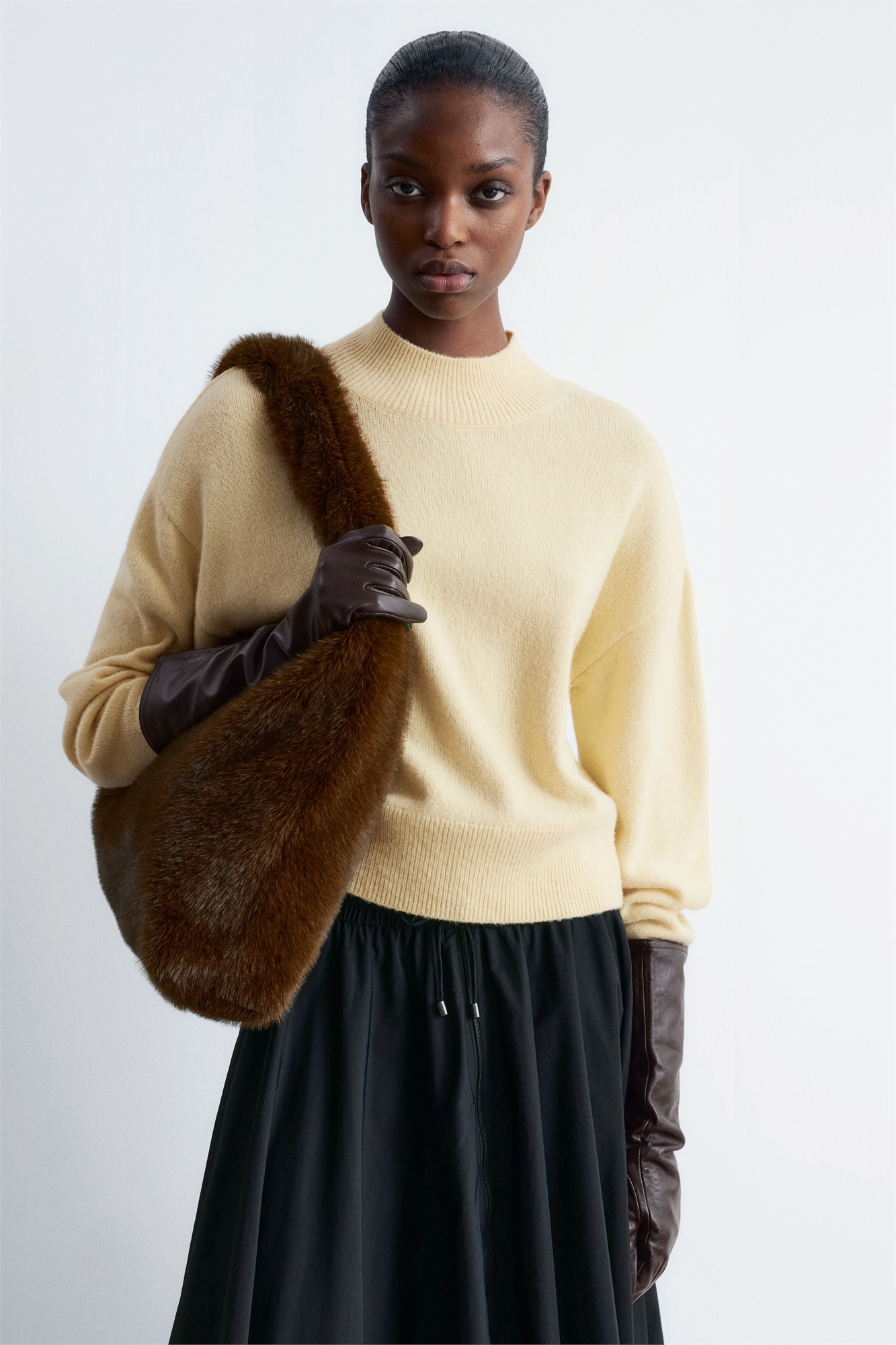 Сумка на плечо из искусственного меха, изготовленная в Индии, имеет скошенный силуэт и закрывается на скрытую магнитную застежку. Подкладка из хлопкового холста