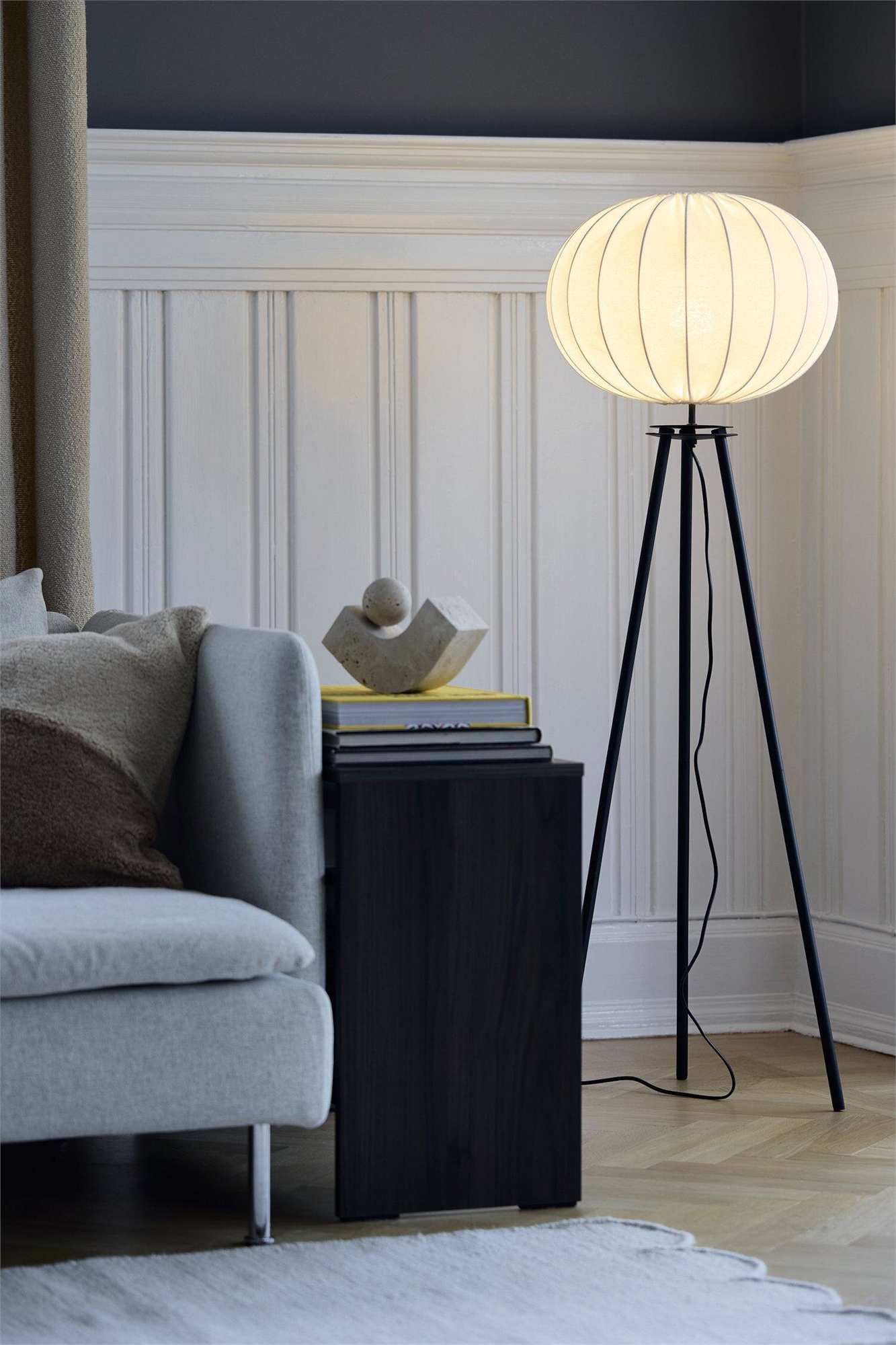 Основание торшера, трехногий металлический торшер, так называемый штатив, с белым абажуром Hilma из хлопка. Диаметр абажура составляет 40 см. Высота 125 см, основание 40x40 см. Черный пластиковый кабель длиной 3,4 м с напольным выключателем, закрепленный на расстоянии 130 см от держателя лампы. Цоколь E27. Макс. мощность 25 Вт. IP20. Регулируемый держатель лампы. Лампочка в комплект не входит. Торшер легко собирается.