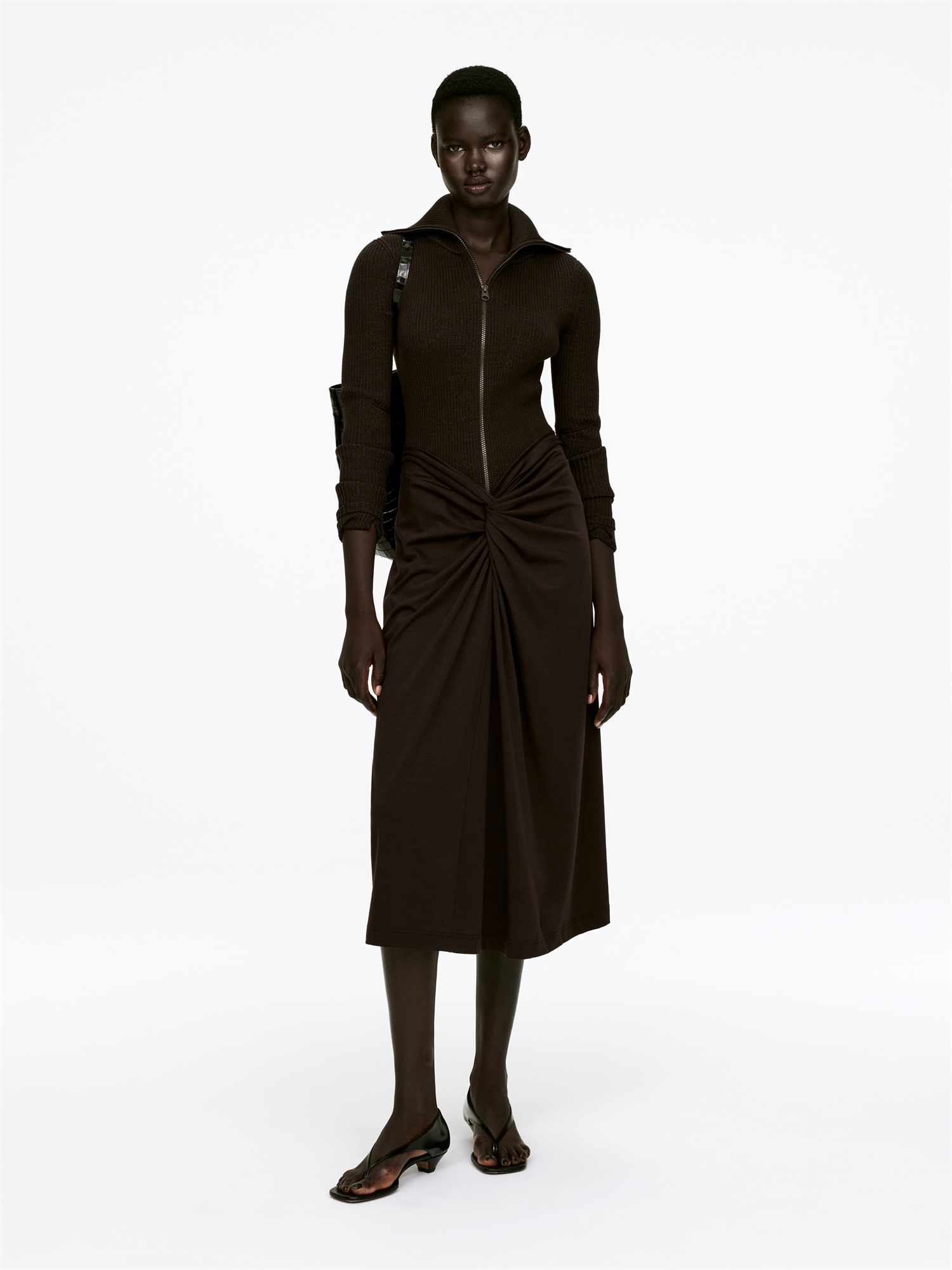Юбка-миди силуэта "тюльпан" из смеси лиоцелла и хлопка. Приталенный фасон с деталью в виде витого узла на поясе спереди и разрезом по центральному шву сзади.