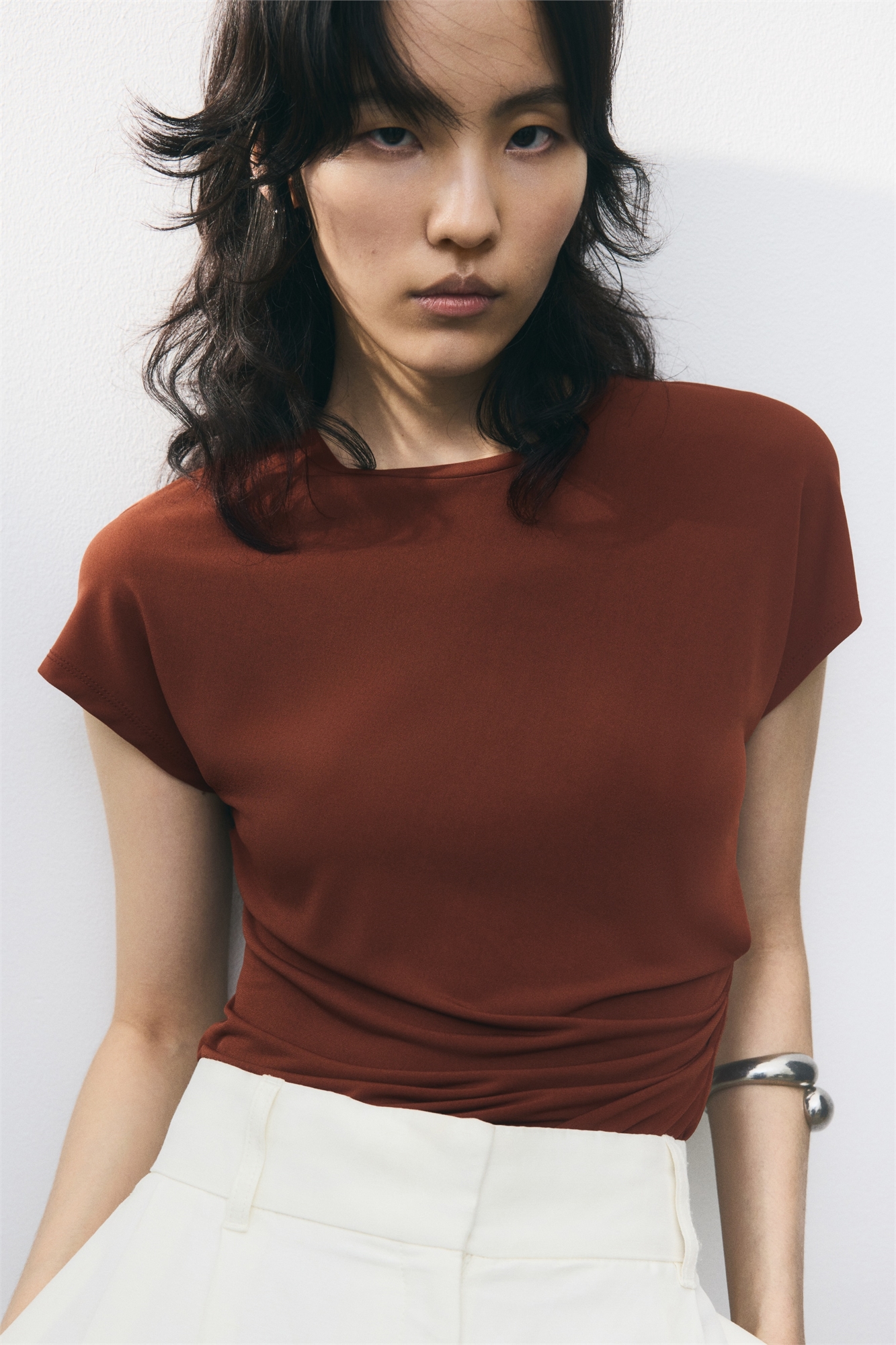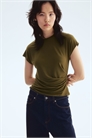 Облегающий топ из мягкого трикотажа с горловиной, рукавами-кап и складками на талии с одной стороны для драпировки.
