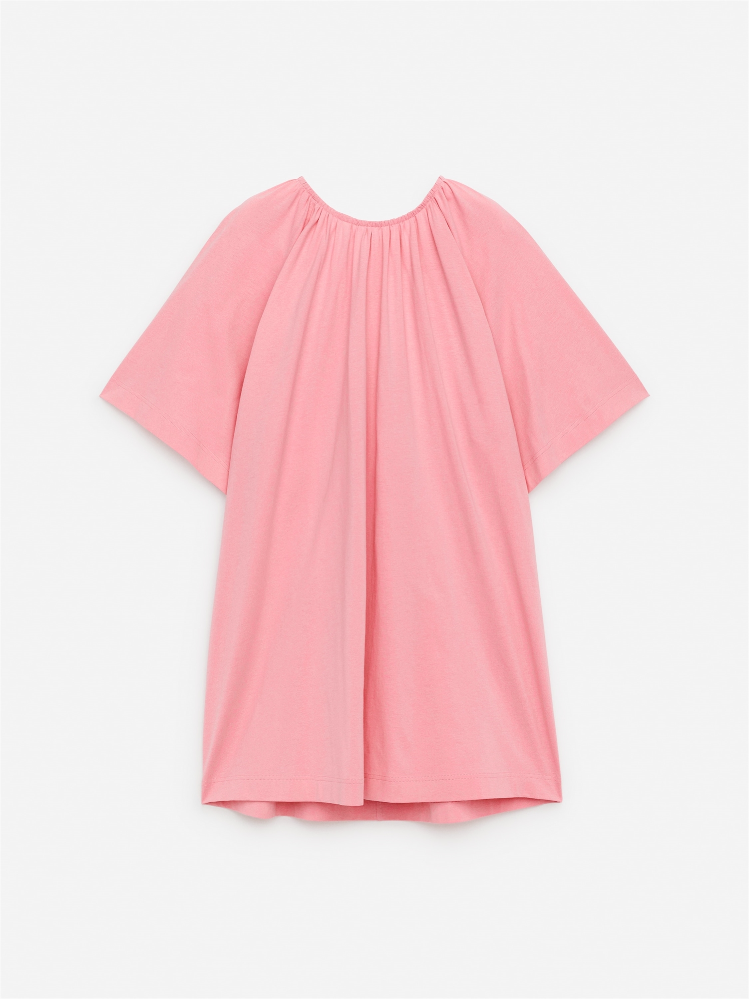 Хлопковое платье со складками у горловины и открытой спиной с завязками. Свободный крой и короткие рукава реглан.