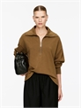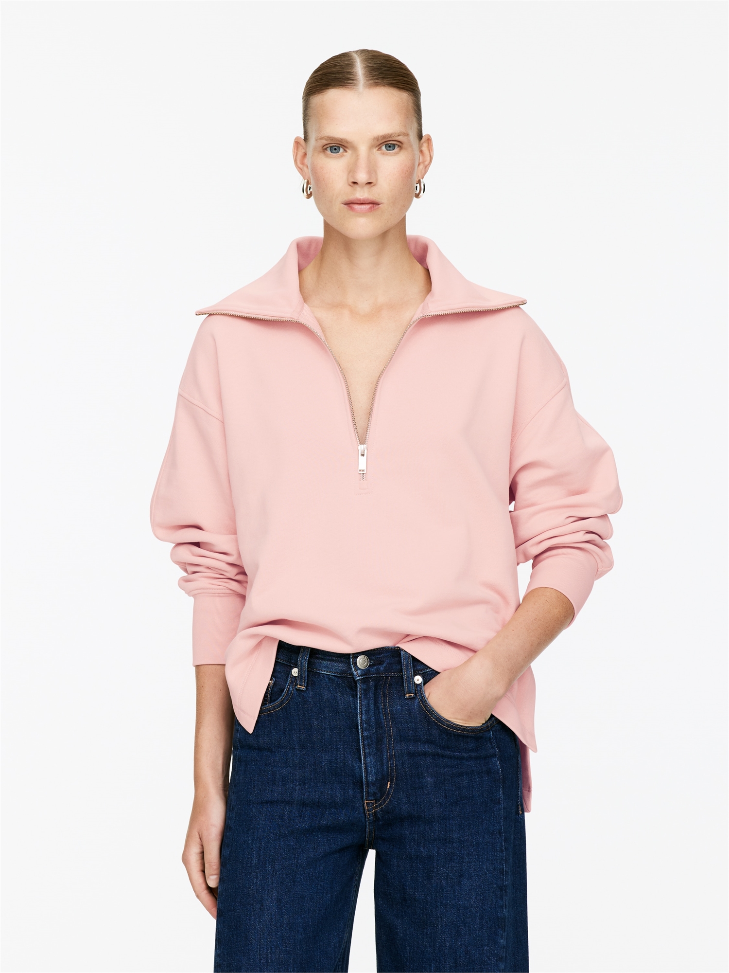 Толстовка из хлопковой махровой ткани с застежкой на молнию и отложным воротником. Модель имеет спущенные плечевые швы, рукава реглан, боковые разрезы и ребристые манжеты.