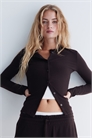 Приталенный кардиган из вафельного трикотажа с круглым вырезом и пуговицами спереди.