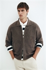 Кардиган из мягкого трикотажа с воротником, двусторонней застежкой-молнией спереди, длинными рукавами и втачными боковыми карманами. Манжеты и подол отделаны тесемками. Регулярный крой обеспечивает удобство ношения и классический силуэт.