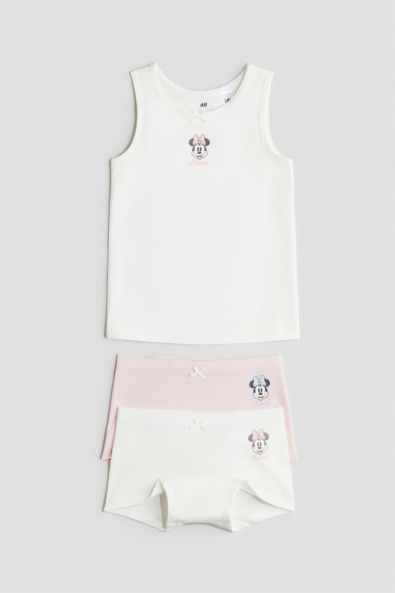 Комплект из жилета и двух пар трусов из мягкого хлопкового джерси с принтом. Жилет с отделкой пико по вырезу горловины и проймам. Трусы с эластичным поясом и ластовицей.