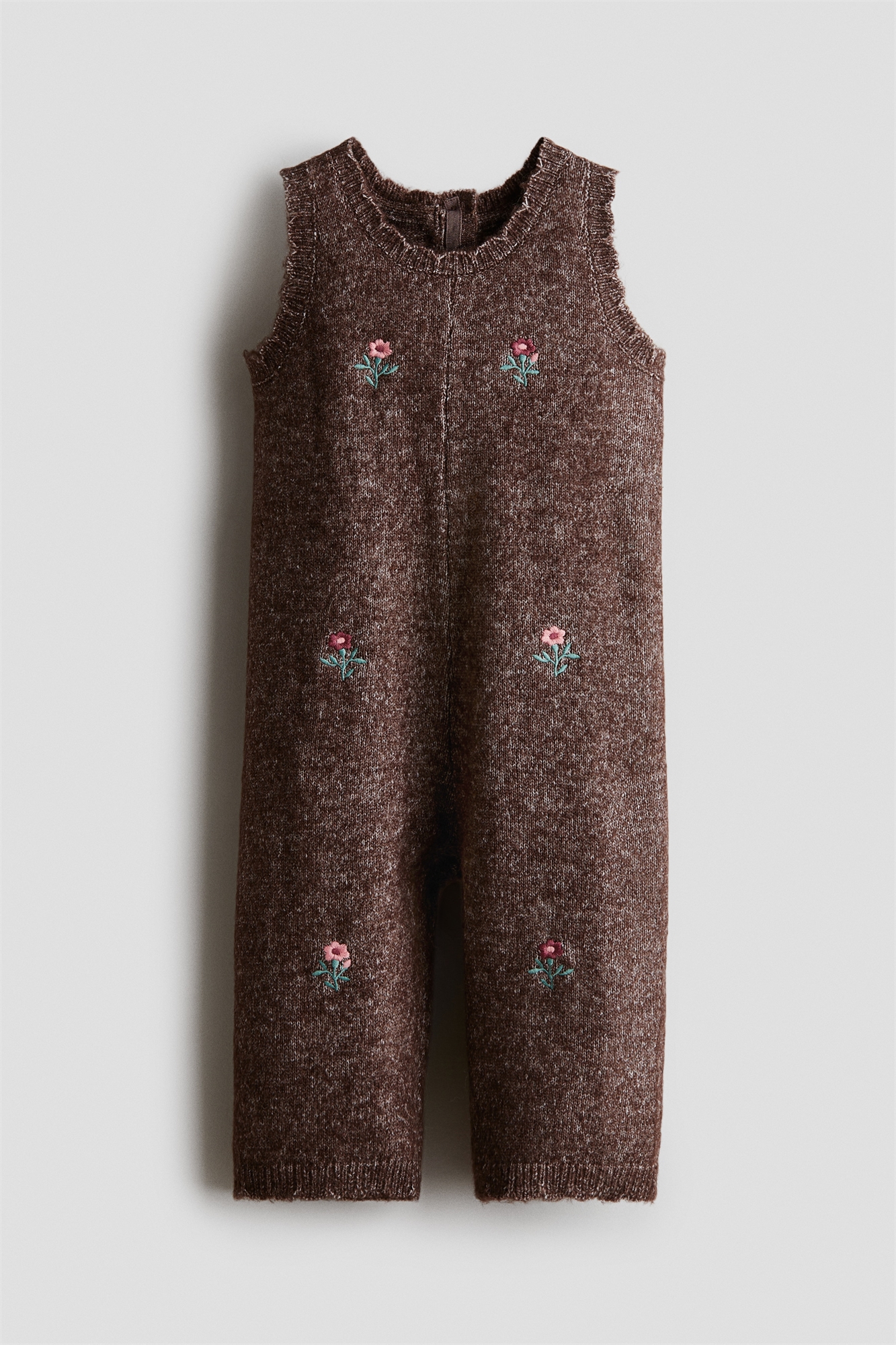 Костюм-ромпер без рукавов из мягкого тонкого трикотажа с мелкими вышитыми цветами и ребристой окантовкой. Круглый вырез и застежка на пуговицы сзади.