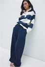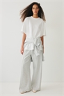 Свободные брюки из легкой толстовочной ткани с мягкой начесом внутри. Эластичный пояс с завязками, незаметные боковые карманы и широкие штанины с застроченными складками спереди.