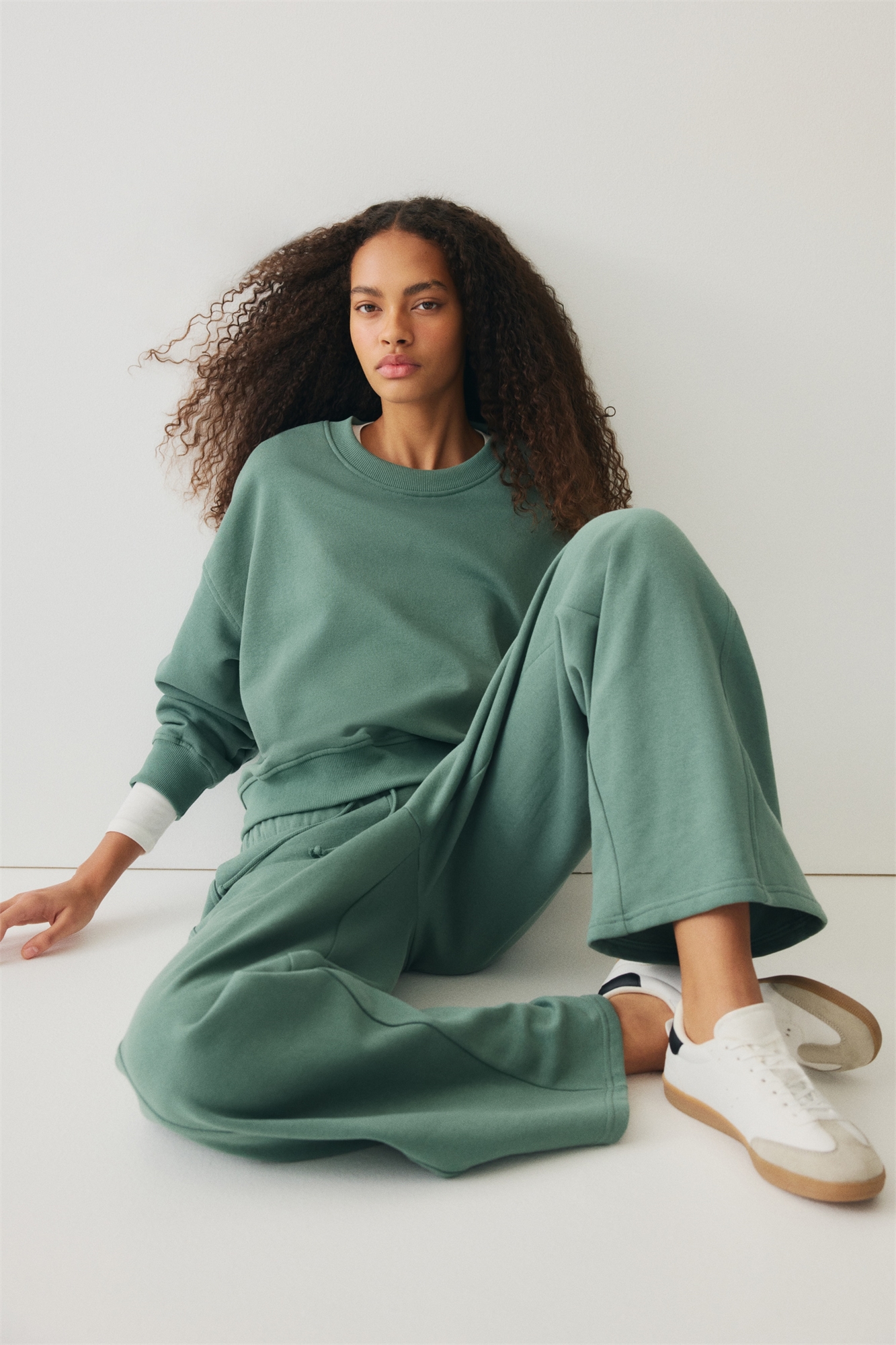 Комплект из топа и джоггеров из толстовки с мягкой ворсистой внутренней стороной. Верхняя часть с круглым вырезом, отделанным ребрами жесткости, передом, спущенными плечами и длинными рукавами. Манжеты и подол отделаны ребрами жесткости. Джоггеры с эластичным утягивающим поясом, неброскими боковыми карманами и широкими штанинами.