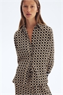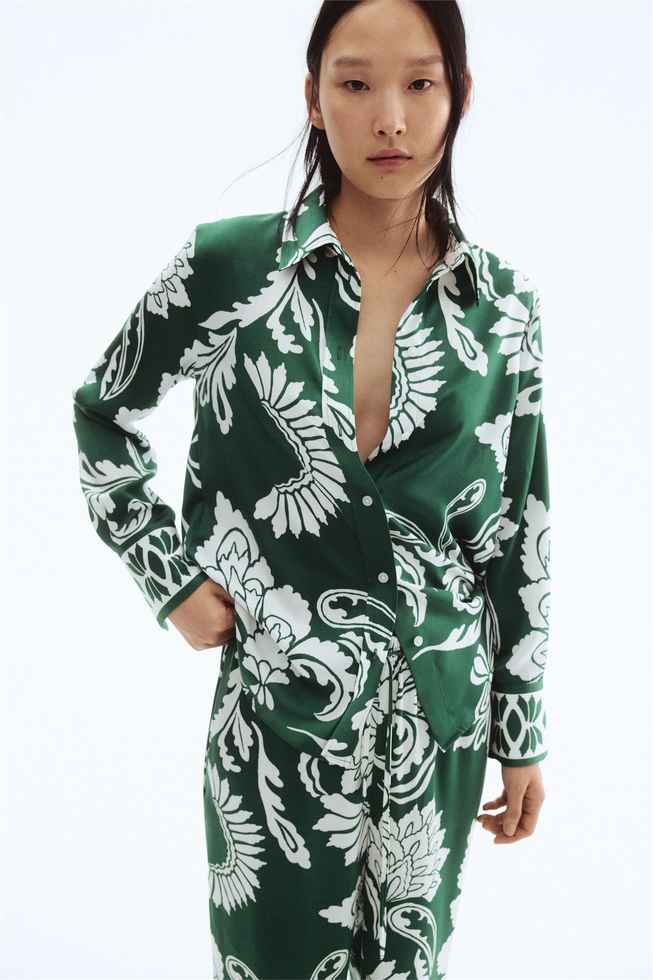 Рубашка из тканого материала с легким блеском и узором по всей поверхности. Воротник, застежка на пуговицы спереди и ярмо со складками сзади. Длинные рукава с манжетами на пуговицах и рукавной планкой с пуговицей. Закругленный подол.