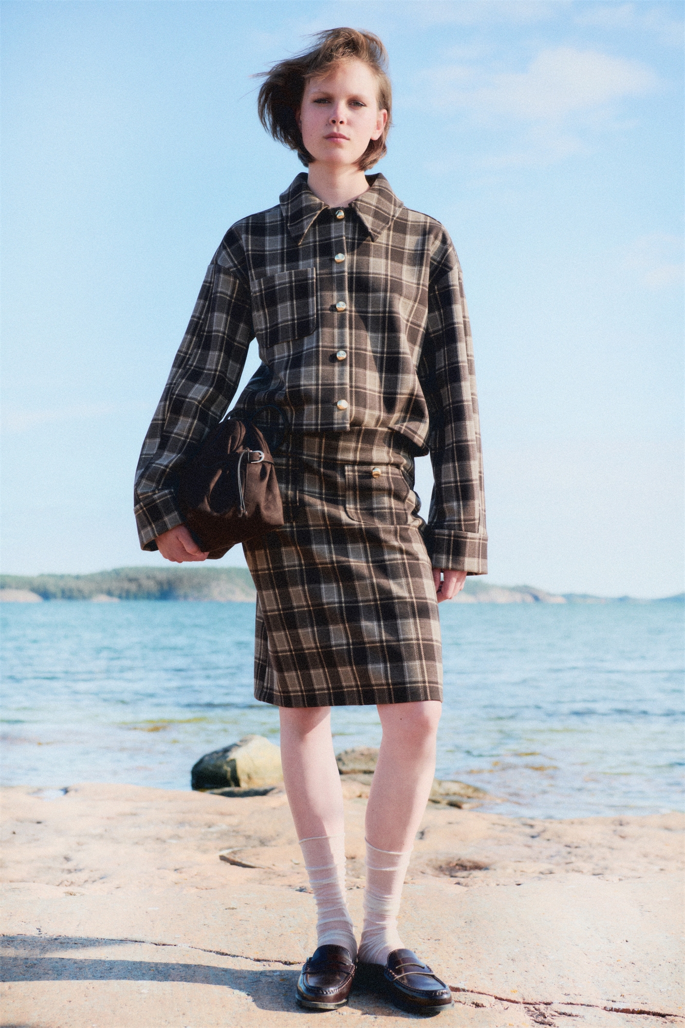 Юбка длиной до колена из бондированного джерси с высокой талией и потайной застежкой-молнией сзади. Накладные передние карманы с металлической пуговицей и прямой подол.