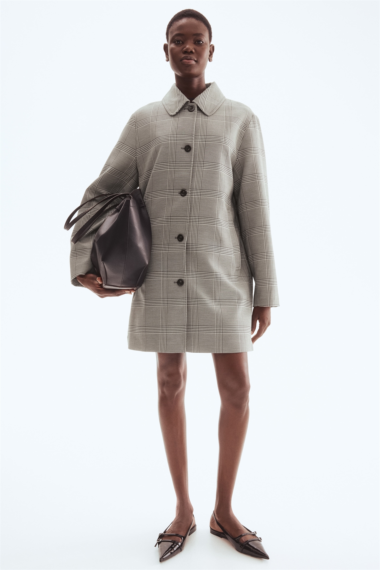 Пальто длиной до колена, А-линия из тканого материала с воротником и пуговицами спереди. Втачные боковые карманы и один вентиляционный проем сзади. На подкладке.