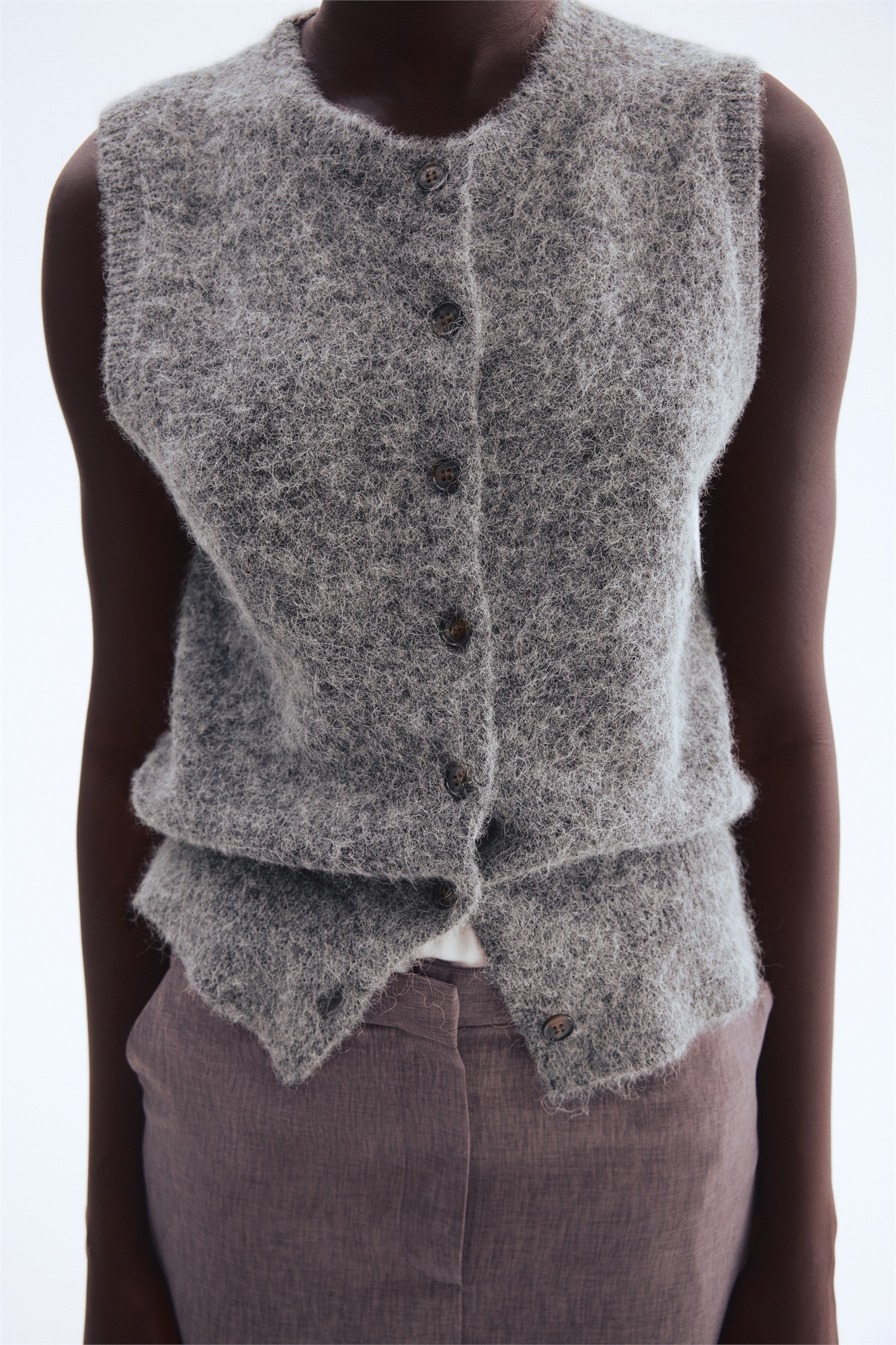 Жилет из мягкого трикотажа с содержанием альпаки и шерсти. Круглый вырез, пуговицы спереди и тесемки по вырезу, проймам и подолу.