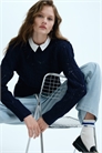 Приталенный джемпер из пуантельевой вязки с добавлением шерсти. Круглый вырез с гребешком, манжеты и подол отделаны тесемкой.