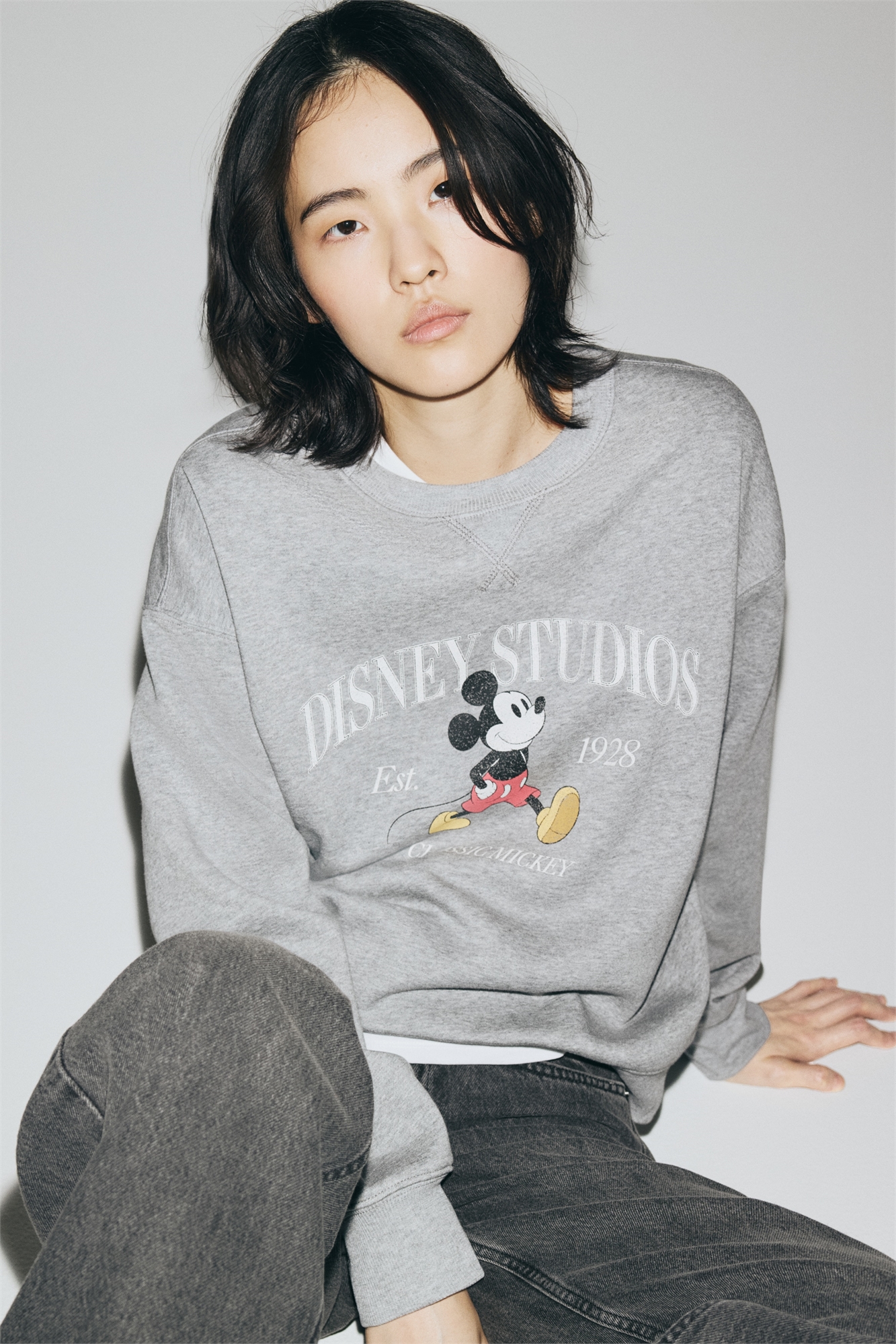 Топ оверсайз из толстовки с мягкой ворсистой внутренней стороной и принтом спереди. Ребристая горловина, спущенные плечи, манжеты и подол в рубчик.