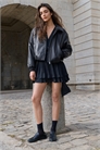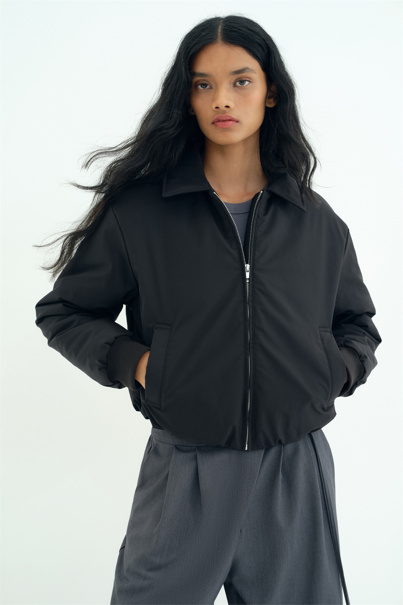 Короткая куртка-бомбер на подкладке из тканого материала с воротником, застежкой-молнией спереди и втачными боковыми карманами. Спущенные плечи, длинные рукава с эластичными манжетами и узкая резинка по подолу. На подкладке.