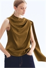 Приталенная блузка без рукавов из блестящего атласа с круглым вырезом и прорезью для ключа с пуговицей сзади. Драпированная часть спереди со складками на одном плече и бретелью в виде шарфа, ниспадающей от плечевого шва.
