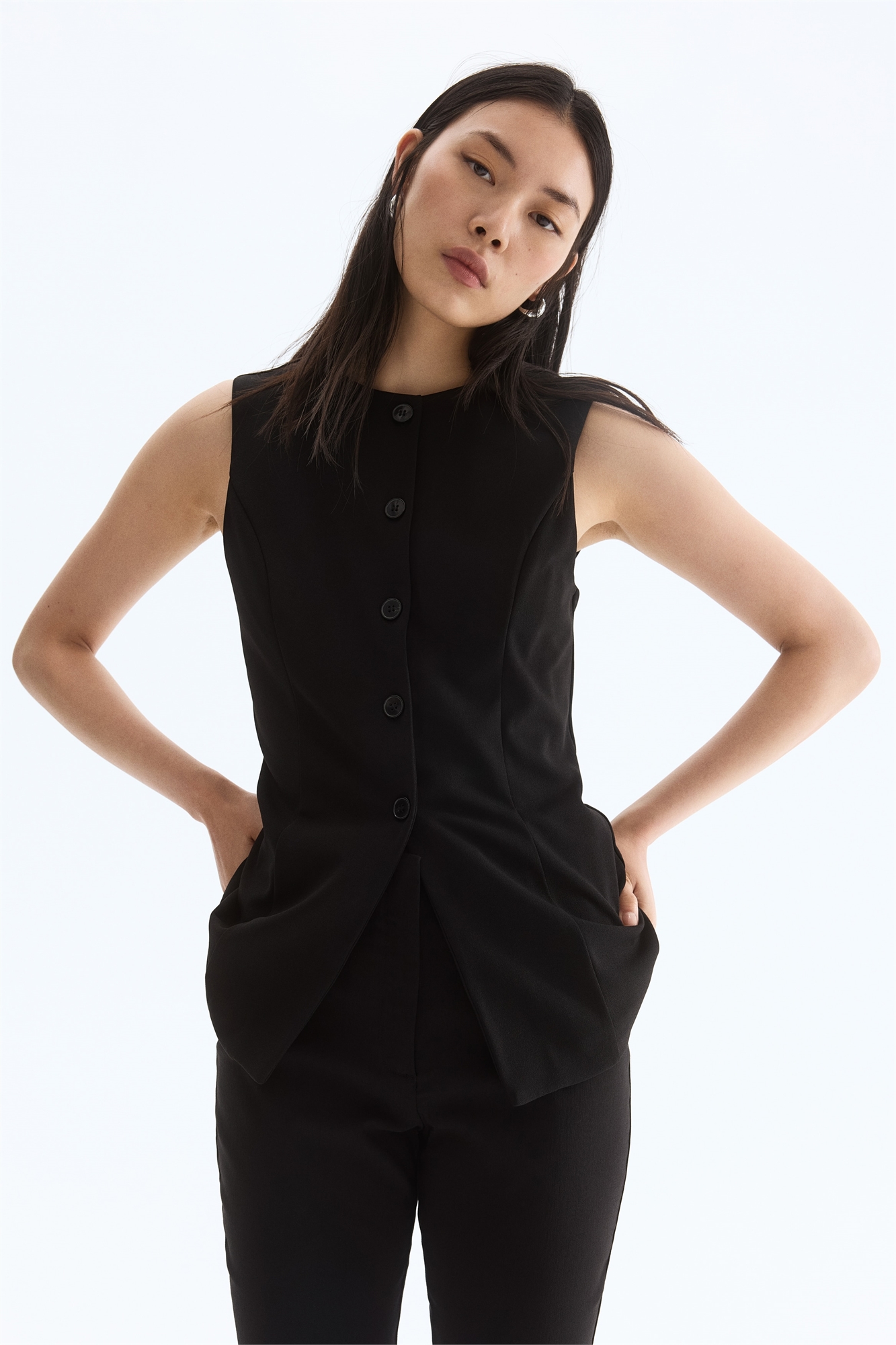 Длинный приталенный жилет из трикотажа Ponte di Roma. Круглый вырез, застежка на пуговицы до талии и расклешенный крой от талии до подола. Швы "принцесса" спереди и сзади подчеркивают расклешенный силуэт. Частично на подкладке.