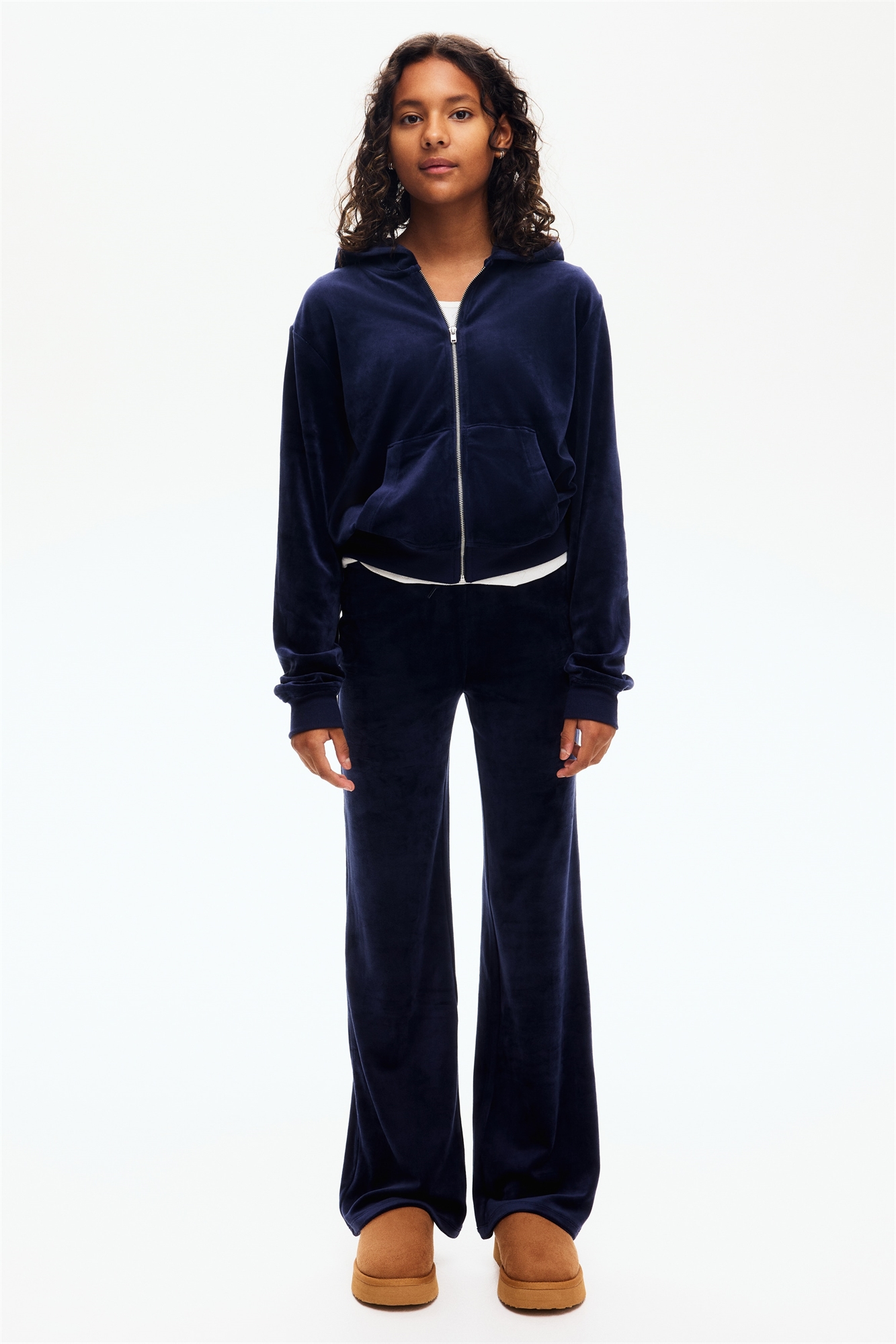 Джоггеры из мягкого велюра с ребристой, эластичной, утягивающей талией и расклешенными ногами.