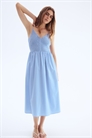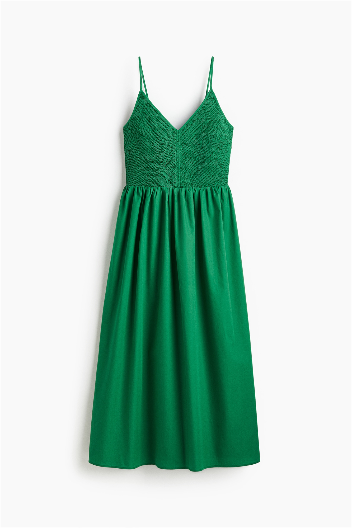 Платье длиной до колен из хлопкового полотна с лифом с V-образным вырезом и узкими регулируемыми бретелями. Эластичная резинка на талии и расклешенная юбка. Без подкладки.