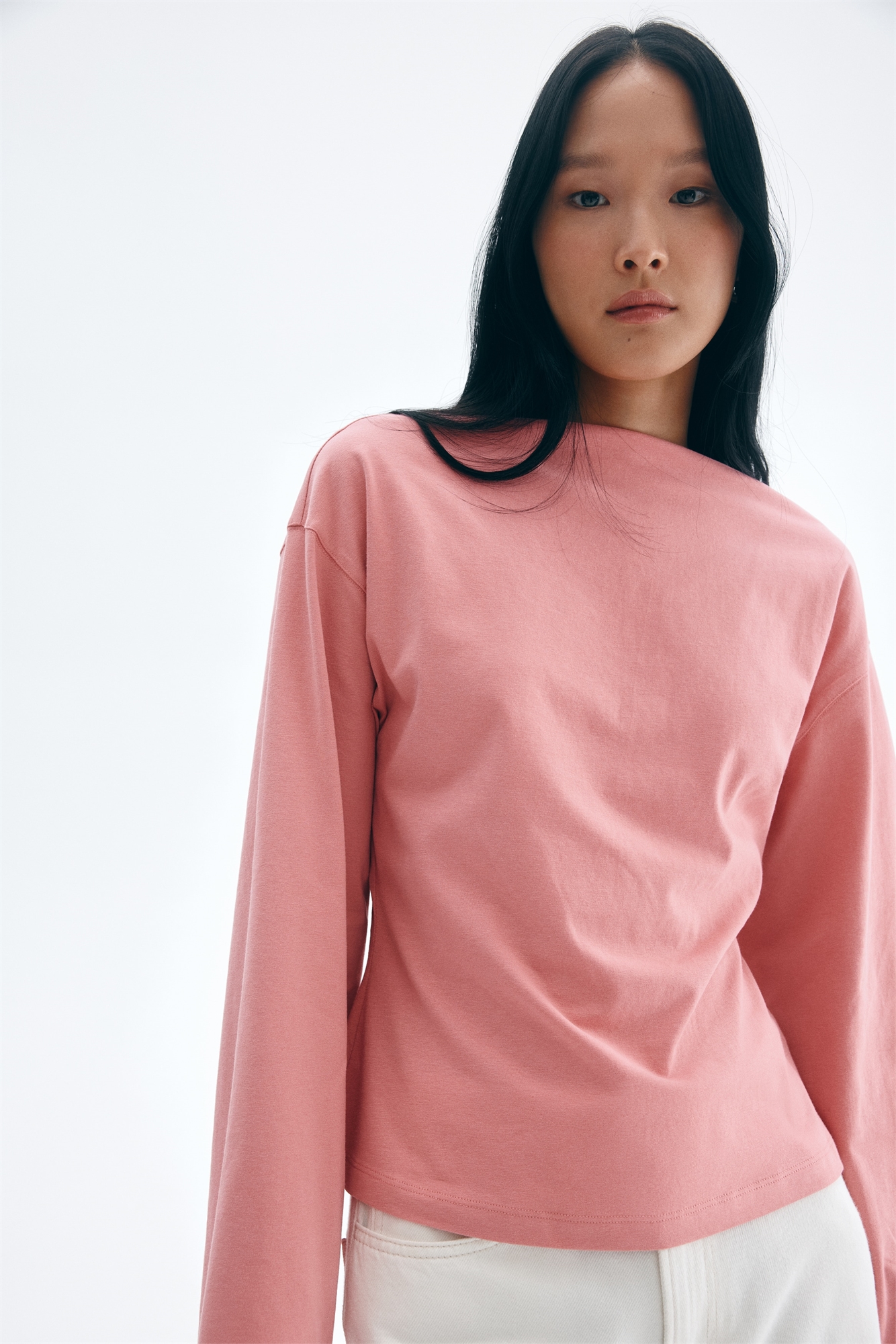 Топ из мягкого хлопкового джерси с вырезом-лодочкой, заниженной талией, спущенными плечами и длинными широкими рукавами.