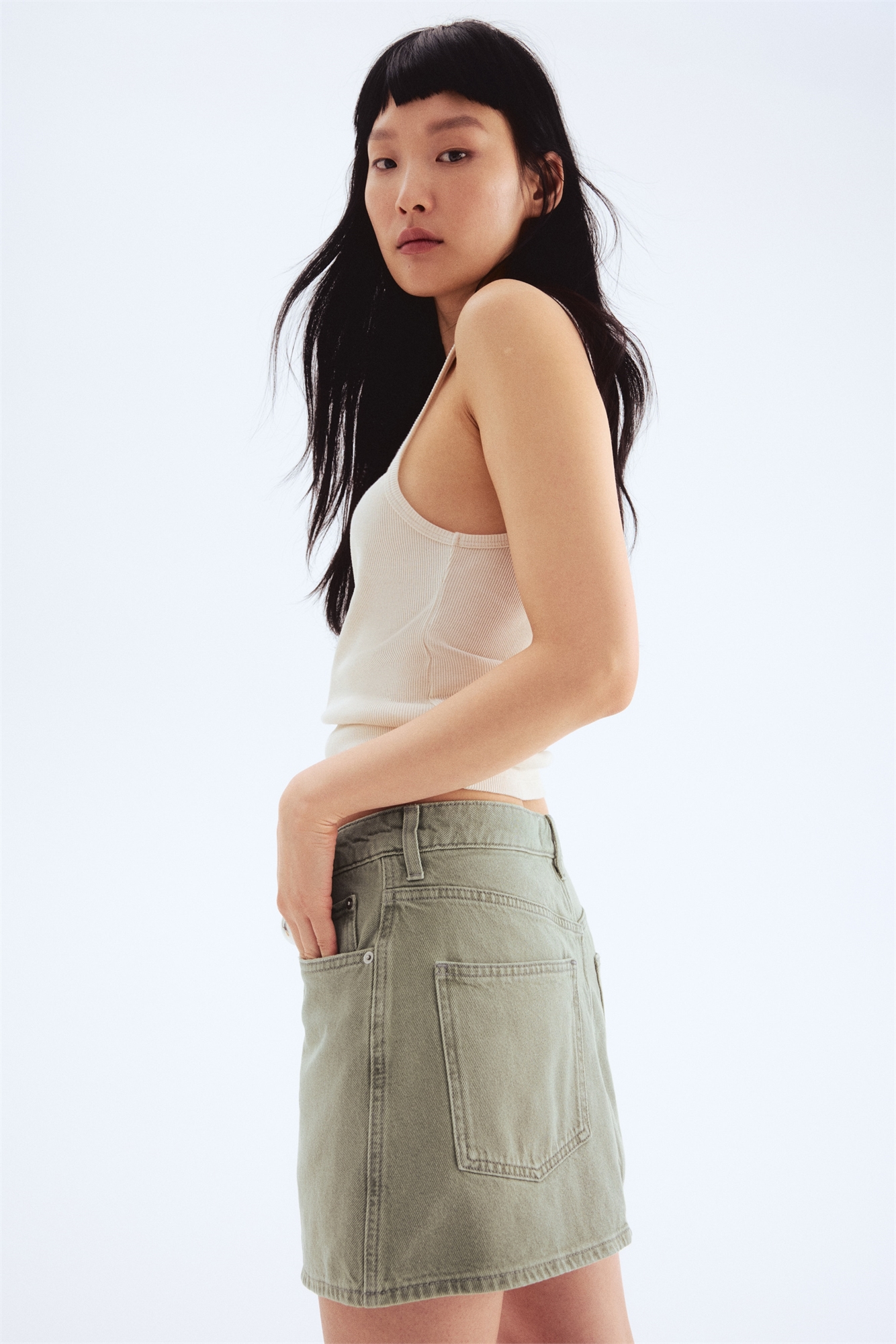 Короткая юбка с 5 карманами из хлопкового денима с заниженной талией и отворотом спереди, застежкой на молнию и пуговицу.