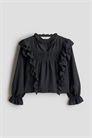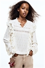 Свободная блузка из мягкого, воздушного полотна с оверлочными краями. Небольшой отложной воротник с проймой, передняя стойка с кружевной отделкой, оборки спереди, переходящие на плечи, и длинные рукава с эластичными манжетами, отделанными оборками.