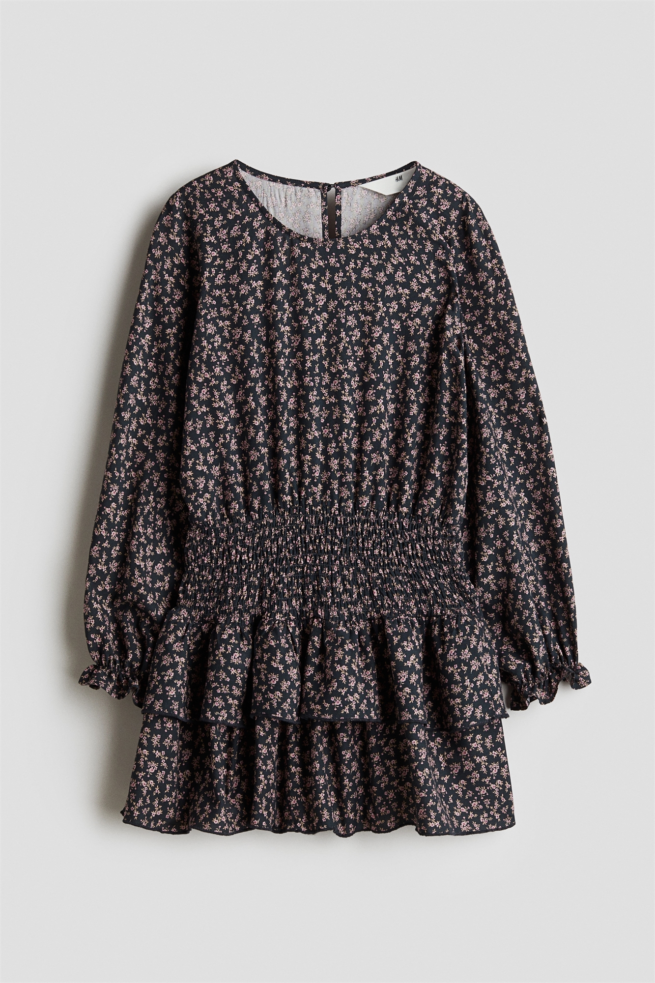 Платье из мягкой ткани с узором по всей поверхности. Круглый вырез, отверстие для ключа с пуговицей сзади и длинные рукава-баллоны с эластичными манжетами с оборками. Завязки на талии и многоярусная юбка с оверлочными краями.