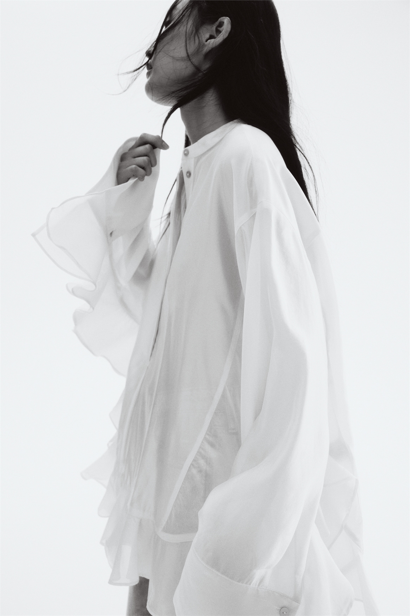Свободная блузка из тканого материала с легким блеском. Воротник-бант, потайная застежка на пуговицах спереди и складка сзади. Спущенные плечи, длинные рукава-долманы с манжетами на пуговицах и воланы вдоль штанины, продолжающиеся по подолу.