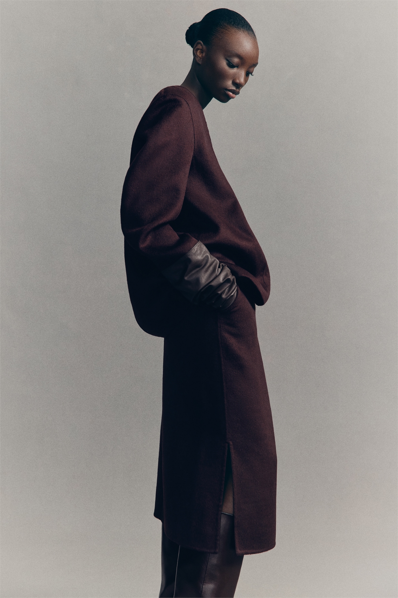 Юбка-карандаш длиной до колен из шерстяной смеси. Регулярная талия, потайная застежка-молния и застежка-крючок сзади. Диагональные боковые карманы и разрез с одной стороны подола. Частично на подкладке.