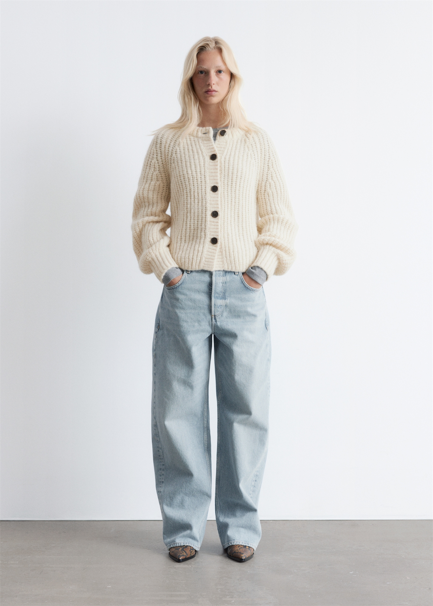 Этот кардиган связан из смеси хлопка, альпаки и шерсти. Кардиган непринужденного силуэта с длинными рукавами-баллонами, ребристой отделкой и пуговицами спереди. 32% RAS Alpaca TE-00047206 31% RWS Wool TE-00047206 Длина кардигана: 53 см / 20,8” (размер S)