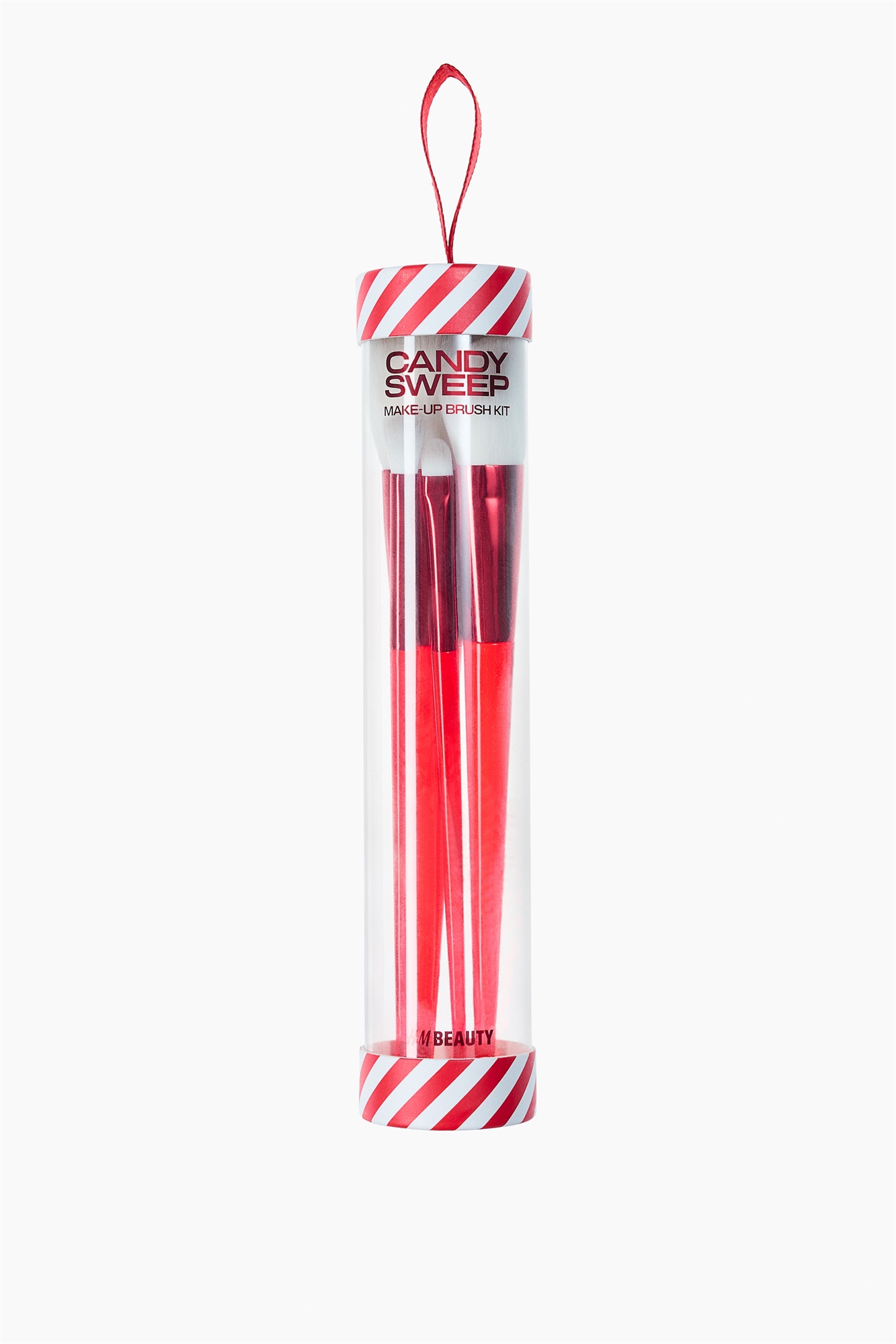 Набор из четырех кистей для макияжа с ручками насыщенного красного цвета в виде леденцовой трости и мягкой белой щетиной. Каждая кисть имеет четкую форму, предназначенную для нанесения макияжа на лицо и глаза. Веганские.