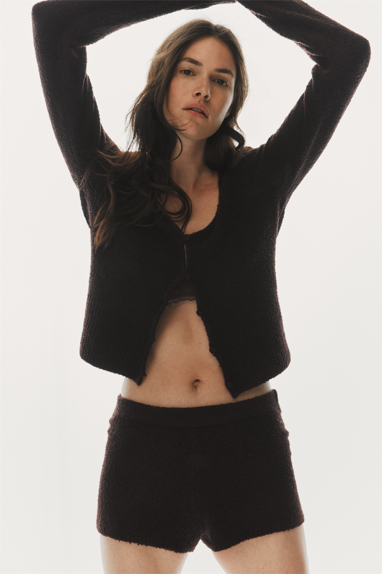 Мини-шорты из мягкого трикотажа букле с эластичной талией и узкой тесьмой по краям.
