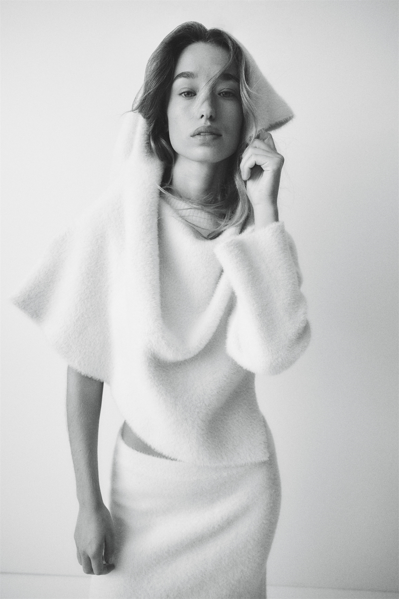 Джемпер из мягкого пушистого трикотажа с горловиной, длинными рукавами реглан и прямым подолом.