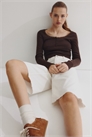 Короткий приталенный топ из хлопкового джерси с кружевным вырезом-лодочкой и застежкой на пуговицы. Длинные рукава и прямой подол.