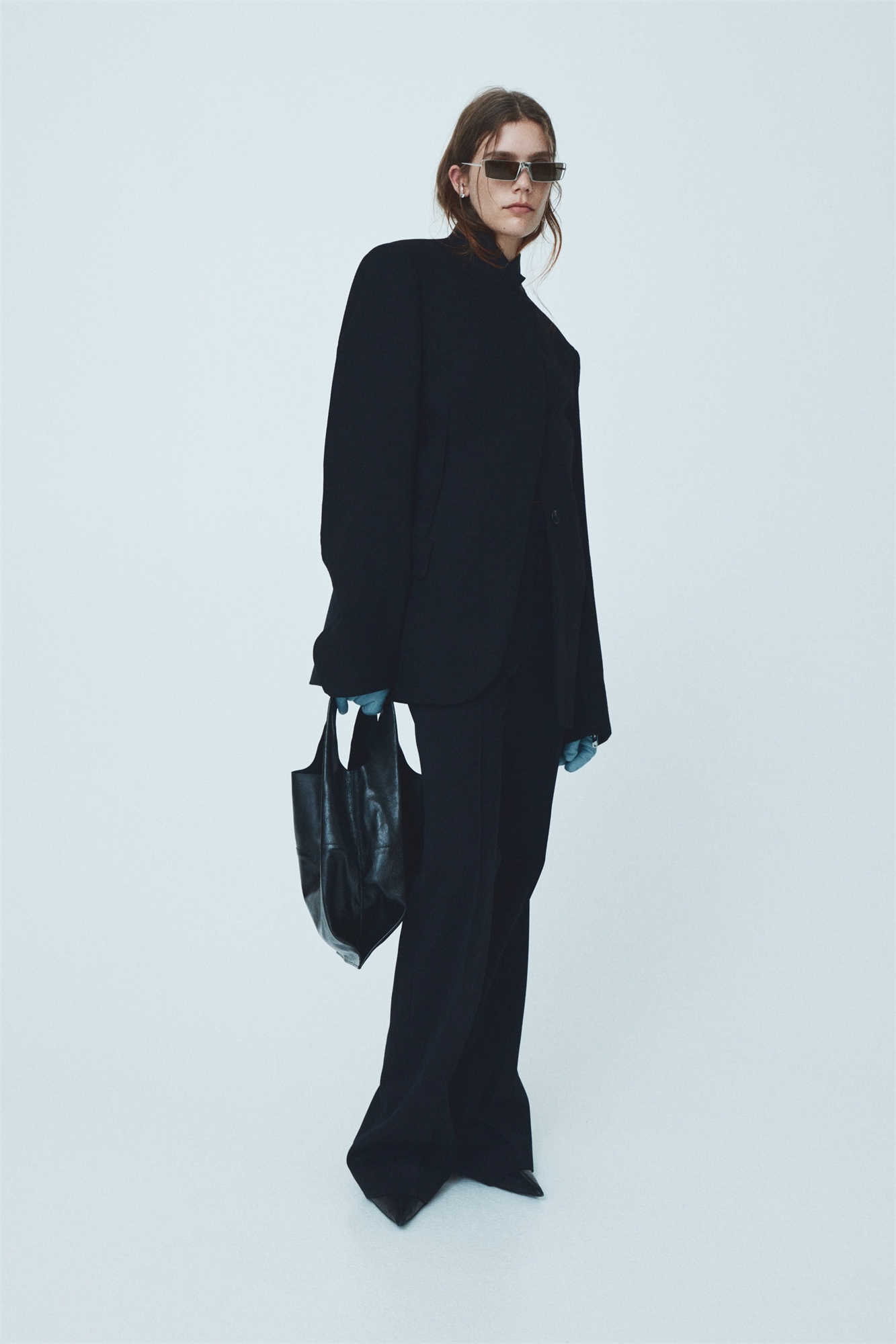 Однобортный блейзер из шерстяной ткани с изнанкой из контрастной ткани. Отложной воротник с фетровой подкладкой, направленной наружу. Передняя часть без лацканов, со скрытыми пуговицами и открытыми вытачками для придания стильного вида. Усиленные плечи с толстыми подплечниками и угловыми швами придают силуэту четкость. Накладные передние карманы и внутренний карман. Длинные рукава с заутюженными складками и одним вентиляционным отверстием сзади. Подкладка из вискозной саржи.