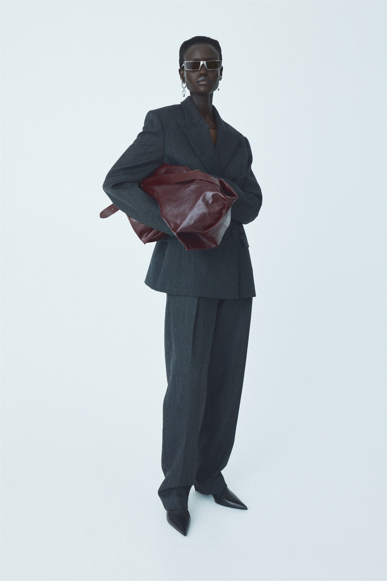 Приталенные брюки из шерсти с деконструированным, удлиненным поясом с необработанным краем и ширинкой на молнии с потайной застежкой на пуговицу и крючок с планкой. Заниженная талия, опущенная промежность и удлиненные бочкообразные ноги со складками спереди и складками спереди и сзади. Диагональные боковые карманы и задний карман на пуговице.
