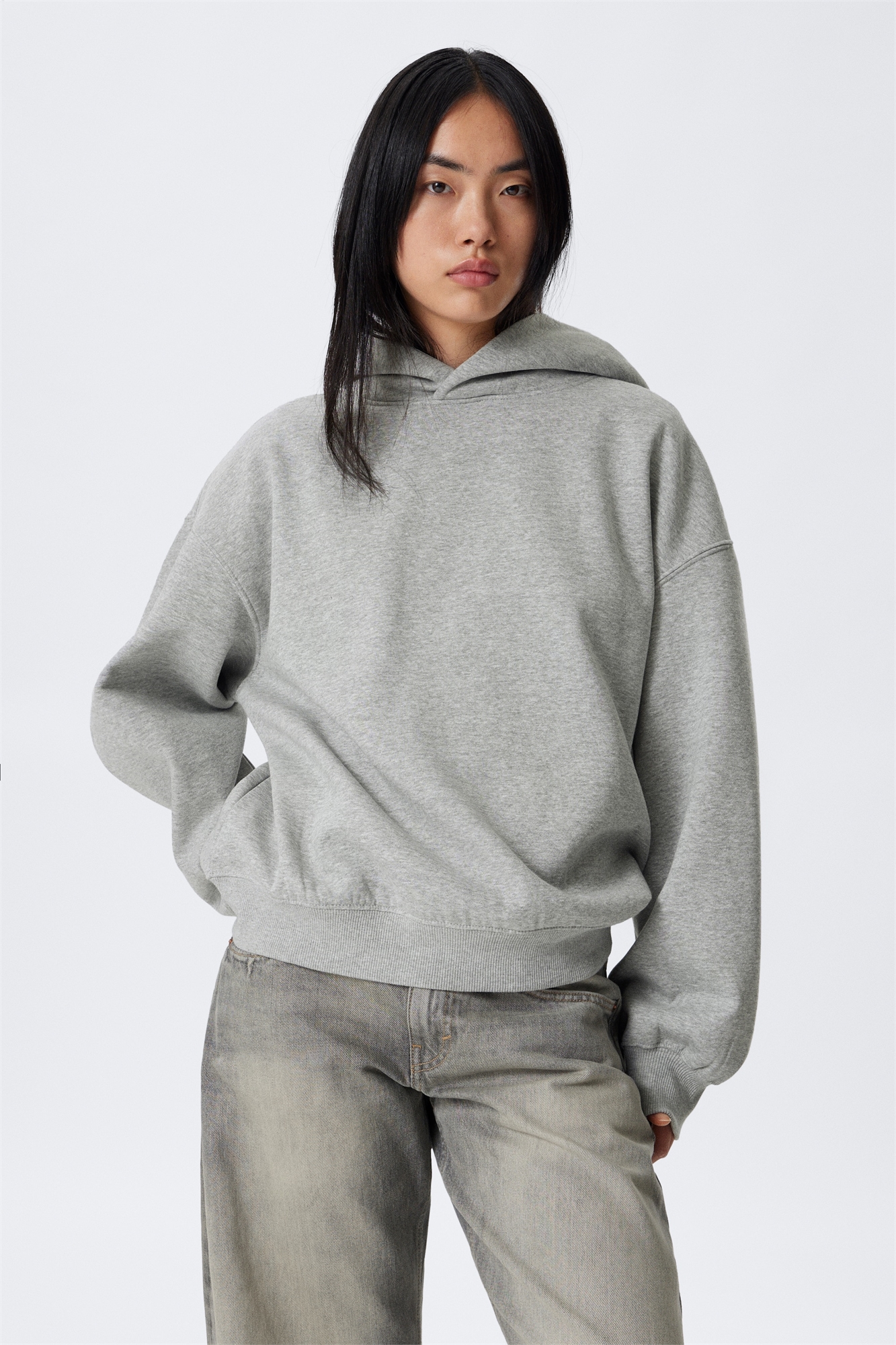 Толстовка оверсайз сшита из мягкого плотного хлопкового флиса. Двухслойный капюшон с изысканной деталью в виде нахлеста спереди, спущенные плечи и широкая ребристая отделка. Манжеты и подол отделаны тонкой тесьмой, что придает силуэту объемность и структурированность.