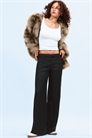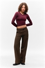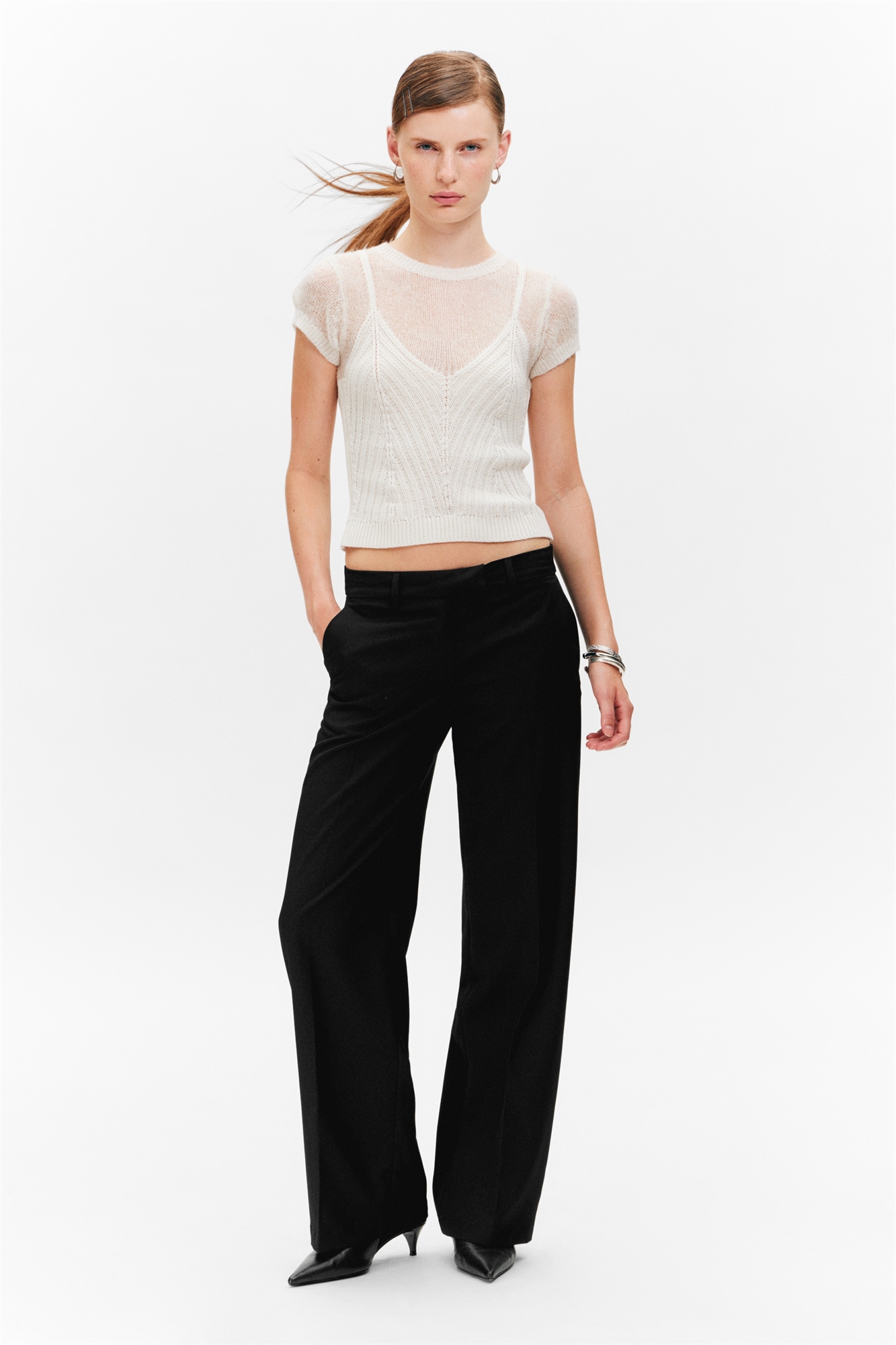 Пара костюмных брюк с низкой посадкой и прямыми штанинами сшита из структурированной ткани. Косые боковые карманы, заутюженные складки и чистый пояс с застежкой на крючок и штангу.