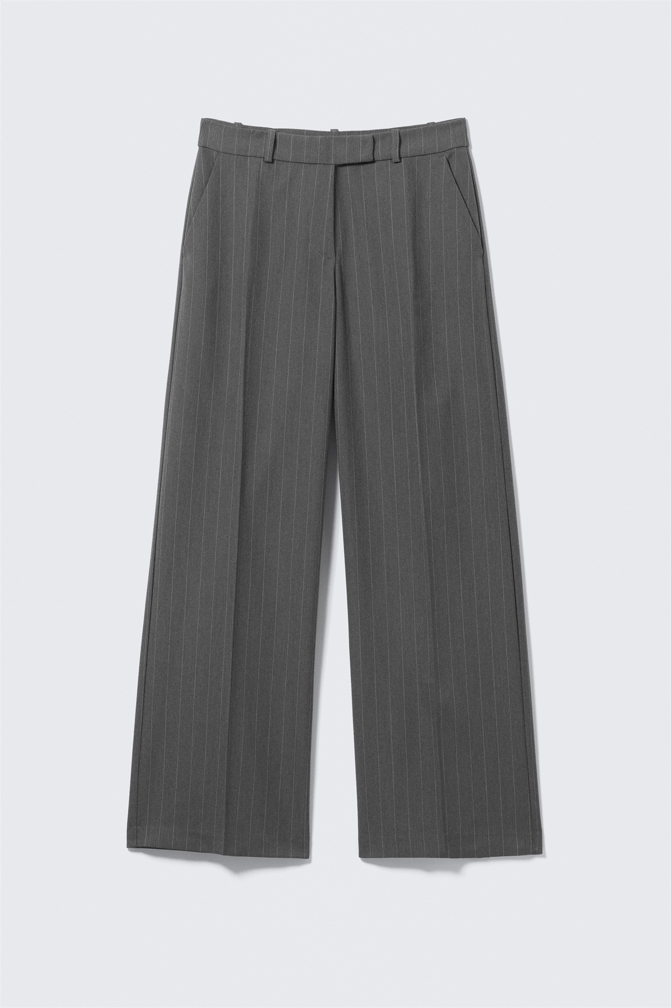 Пара костюмных брюк с низкой посадкой и прямыми штанинами сшита из структурированной ткани. Косые боковые карманы, заутюженные складки и чистый пояс с застежкой на крючок и штангу.