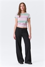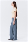 Пара костюмных брюк с низкой посадкой и прямыми штанинами сшита из структурированной ткани. Косые боковые карманы, заутюженные складки и чистый пояс с застежкой на крючок и штангу.