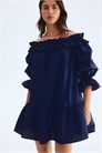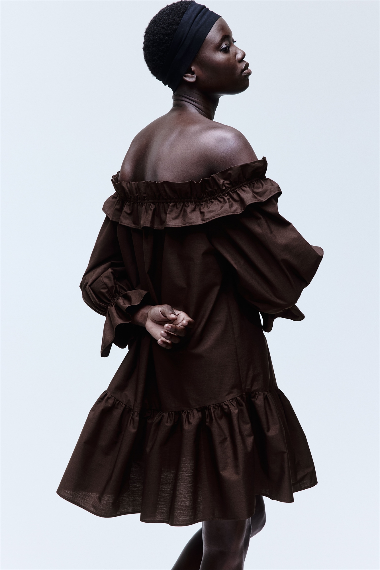 Короткое платье больших размеров из хрустящего хлопкового поплина с оборчатым вырезом на плечах и длинными рукавами с оборчатыми манжетами и узкой резинкой вокруг запястий. Присборенный шов ниже бедер придает дополнительный объем. Без подкладки.
